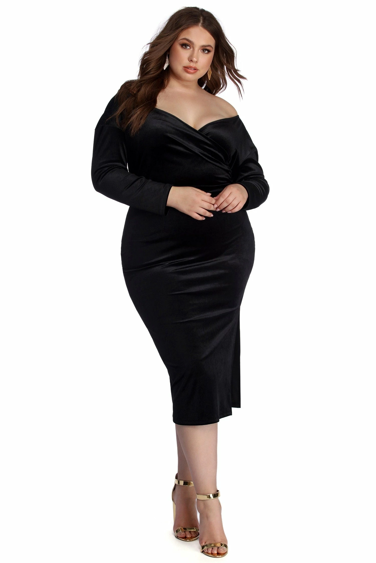 Elevate your evening look with in luxe velvet as you make your entrance in our lovely Kenia dress! She features a black hue, an off the shoulder neckline with a wrap V neck bust, long sleeves and a midi length silhouette with a side slit. She is composed of a lined velvet fabric that offers a curve hugging fit with a moderate stretch.