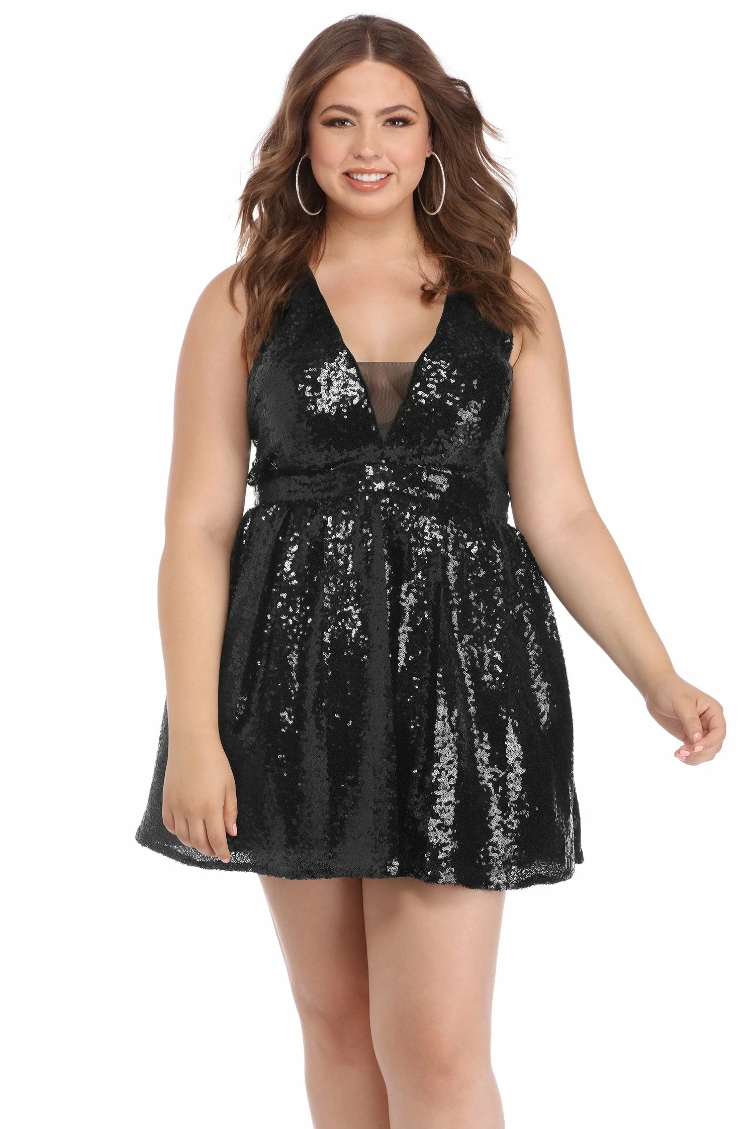 Make it a night to remember in this fun party dress! Steph is composed of all over sequin fabric and features a sleeveless bodice with a plunging V neckline and small mesh inset, an A-line silhouette, a tulle petticoat for added flare, pockets and a back zipper.