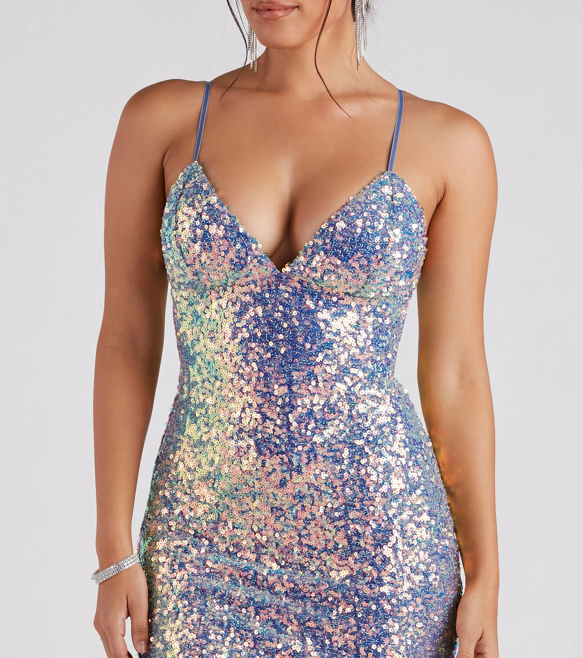 Shine bright like a diamond in the Rhianna formal dress covered in iridescent sequins to wow from head to toe at banquets or bachelorettes! She features a sleeveless V-neckline, adjustable spaghetti straps, a padded bust, a flattering bodycon silhouette, back slit accent, and a midi-length hem. The formal dress is composed of iridescent sequin-embellished mesh fabric that causes a rainbow-like color effect under lights and is designed with a smooth knit stretchy lining. Complete the look in a