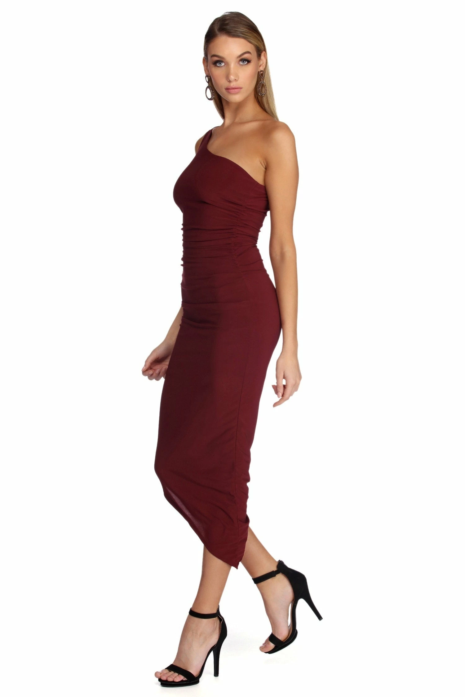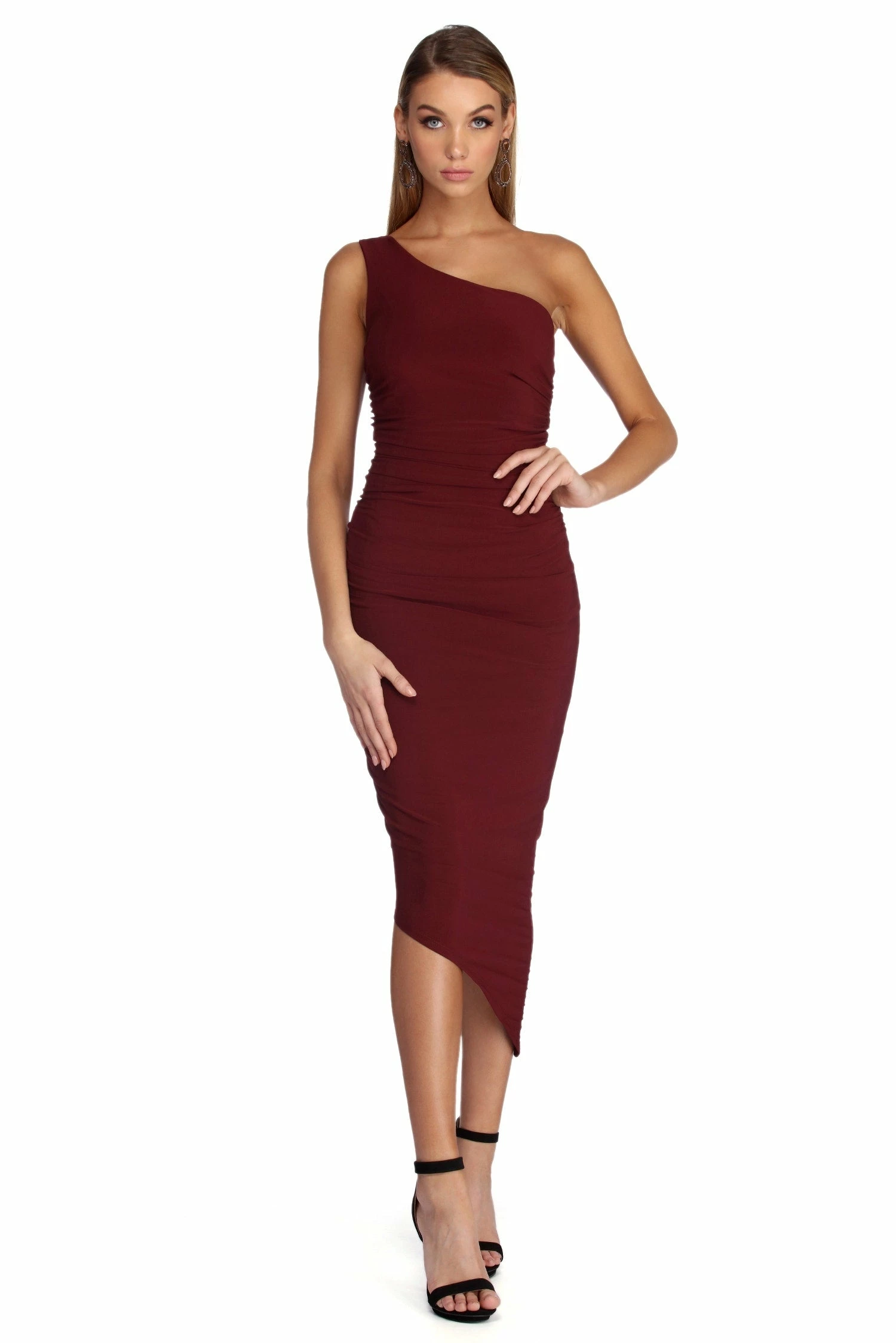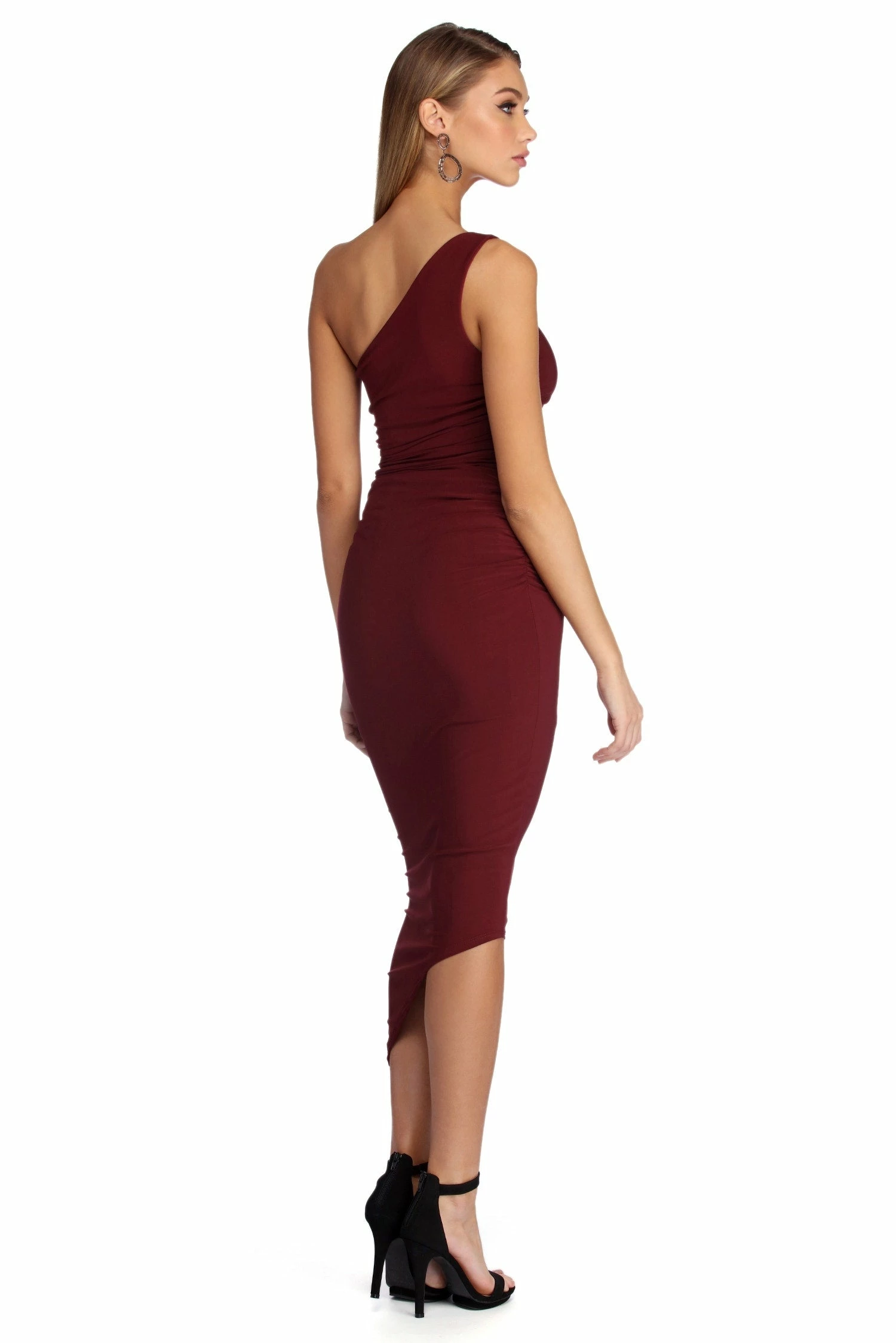 Stun with a little shoulder action as you channel sophistication in our Selena dress! She features a classic black hue, a one shoulder neckline with a single shoulder strap and a ruched side detail. Her slim fit bodice leads to an asymmetrical hem to show off your fab heel game! Dress is composed of a lined smooth knit fabric that offers a form hugging fit with a moderate stretch.