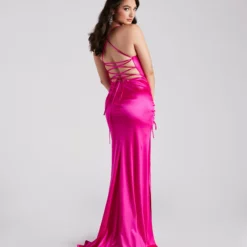 Oh-so-chic and stunning, captive them all in the Serenity satin formal dress. She features a sleeveless cowl neckline, spaghetti straps, an open back with a cross-back lace-up strappy design, a high waist seam, front ruched detailing leading to a high front slit, and a flowy, floor-length, A-line silhouette. The smooth satin fabric offers a moderate stretch. Complete the look with