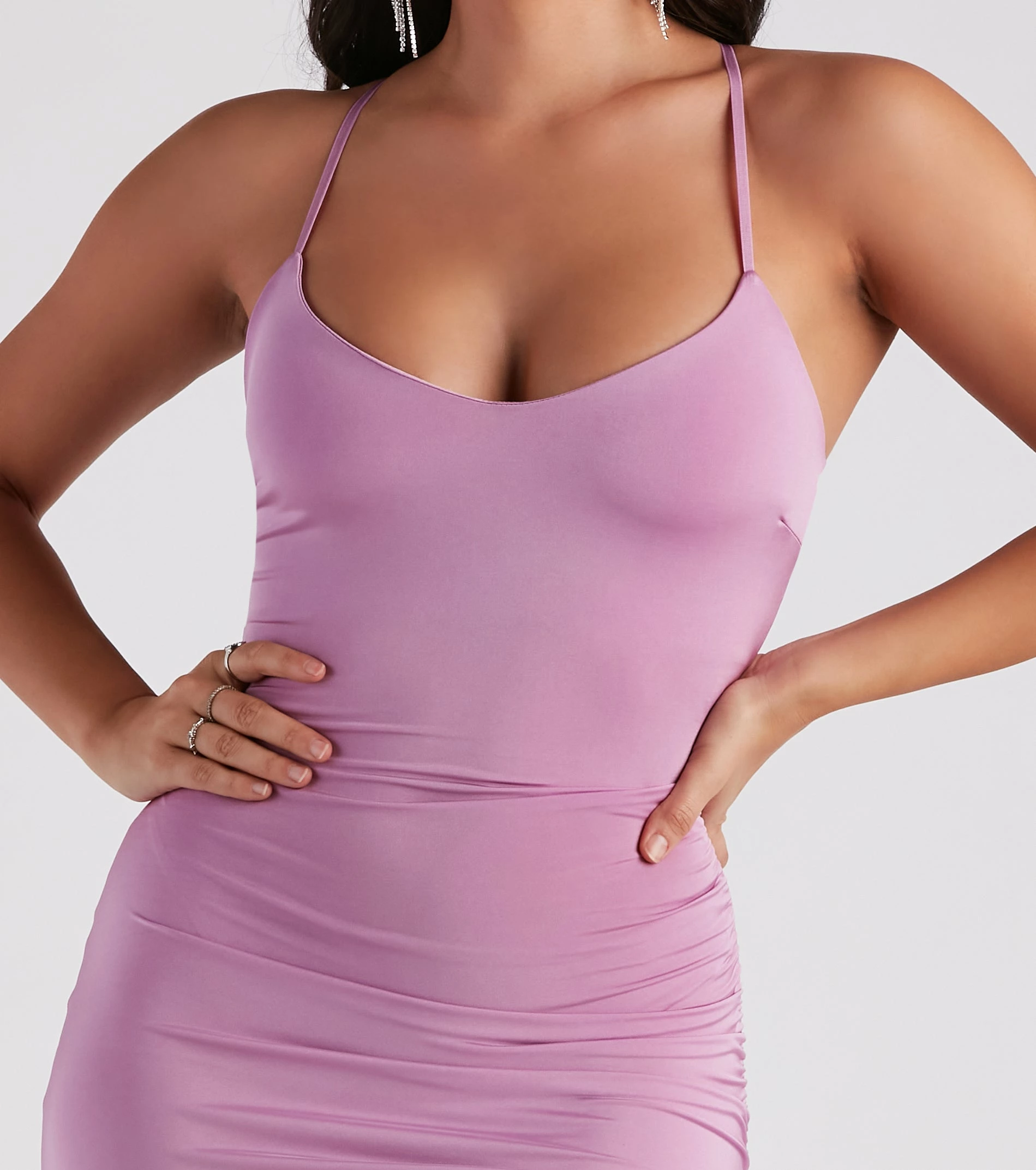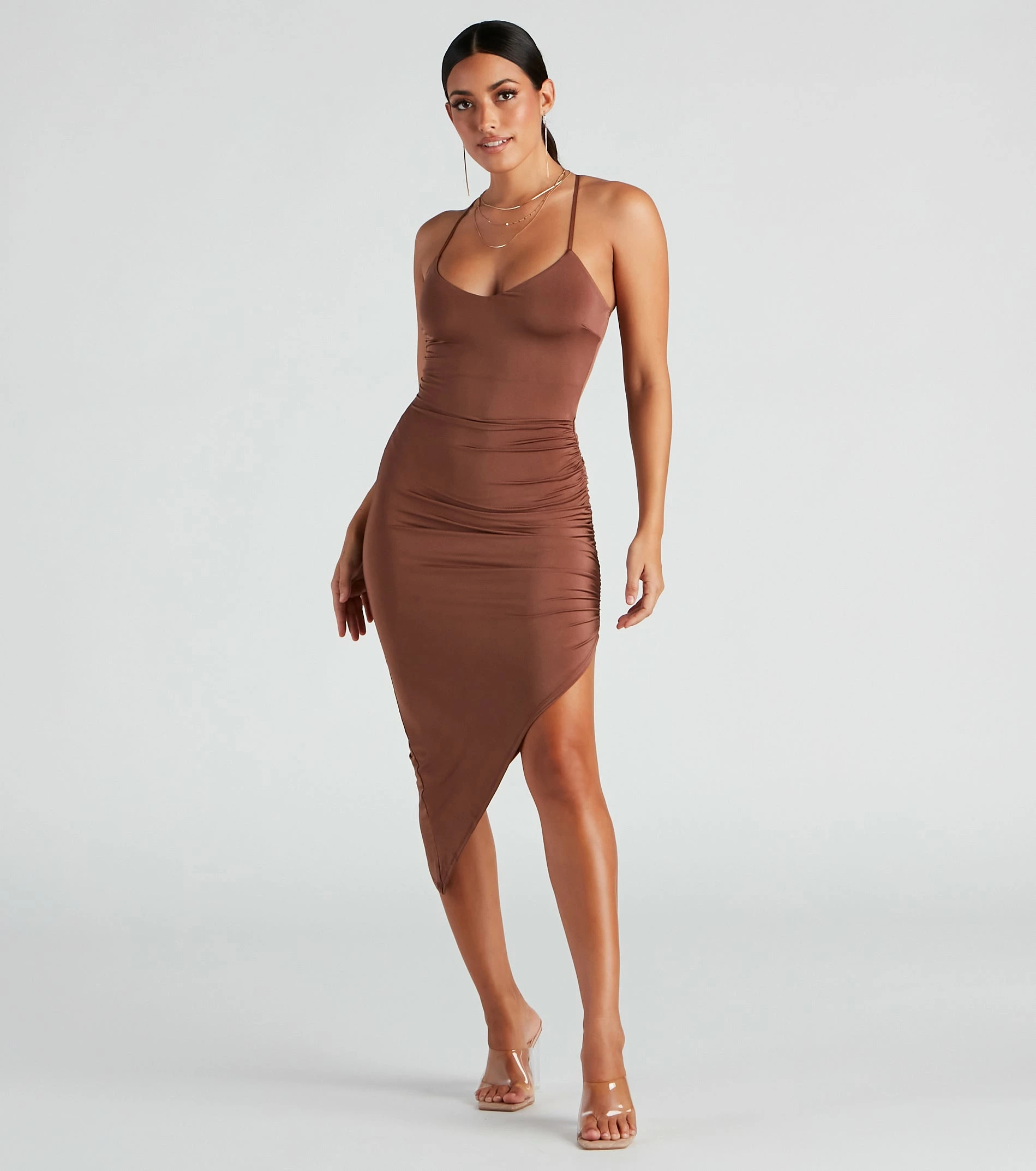 Show off your fab figure in this sleek and sultry knit midi dress for a dressy occasion! It features a sleeveless V-neck with adjustable spaghetti straps that cross along the back, a bodycon silhouette, and a side ruched seam atop the asymmetrical side slit hem. Complete the look in a dainty