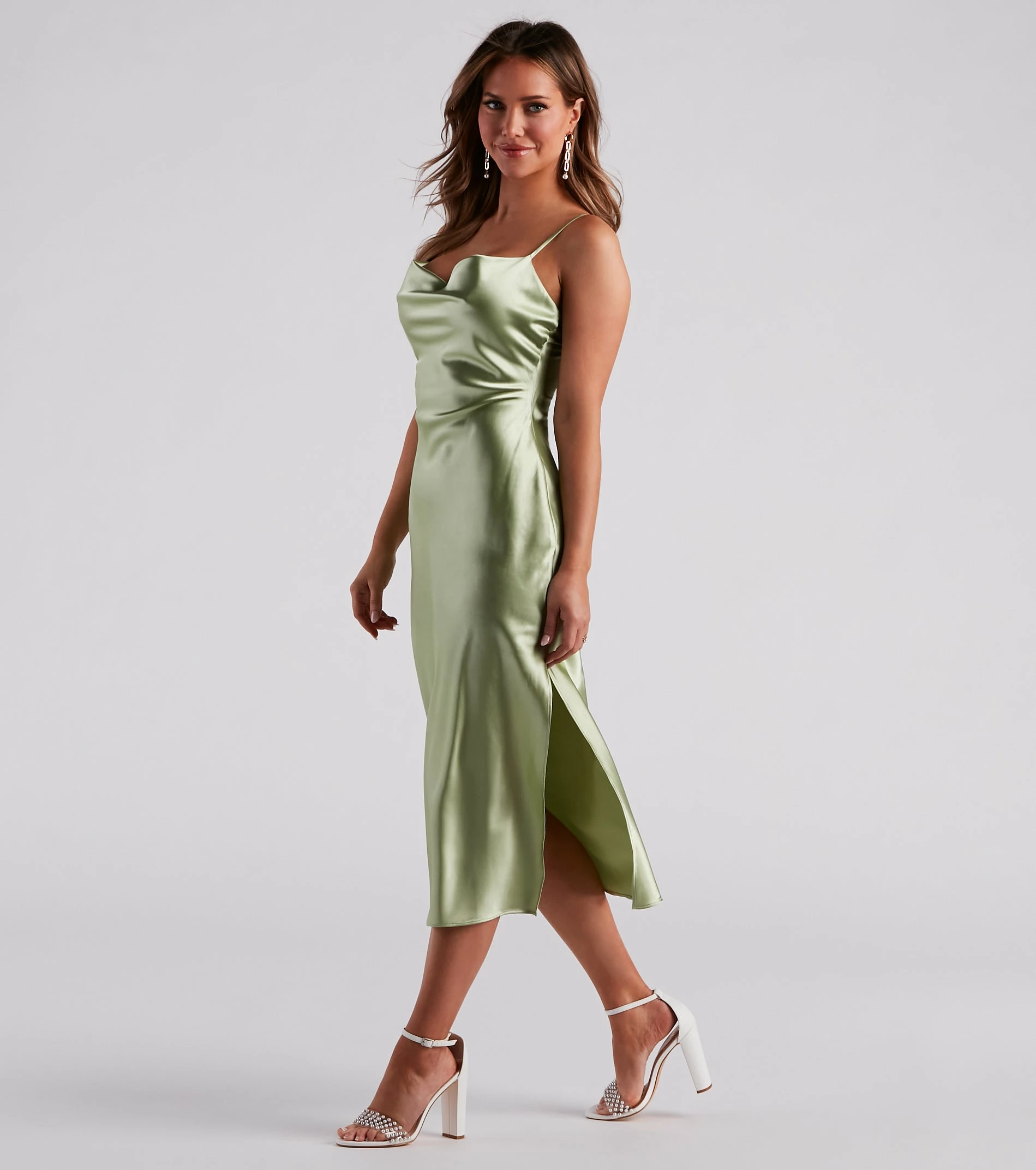 This silky sleek satin slip midi dress will create the prettiest party outfit! It features a sleeveless cowl neckline, adjustable spaghetti straps for a customized fit, a midi-length hem, and a flowy A-line silhouette. The lightweight satin woven fabric will catch the light with its eye-catching sheen. Style with a pair of