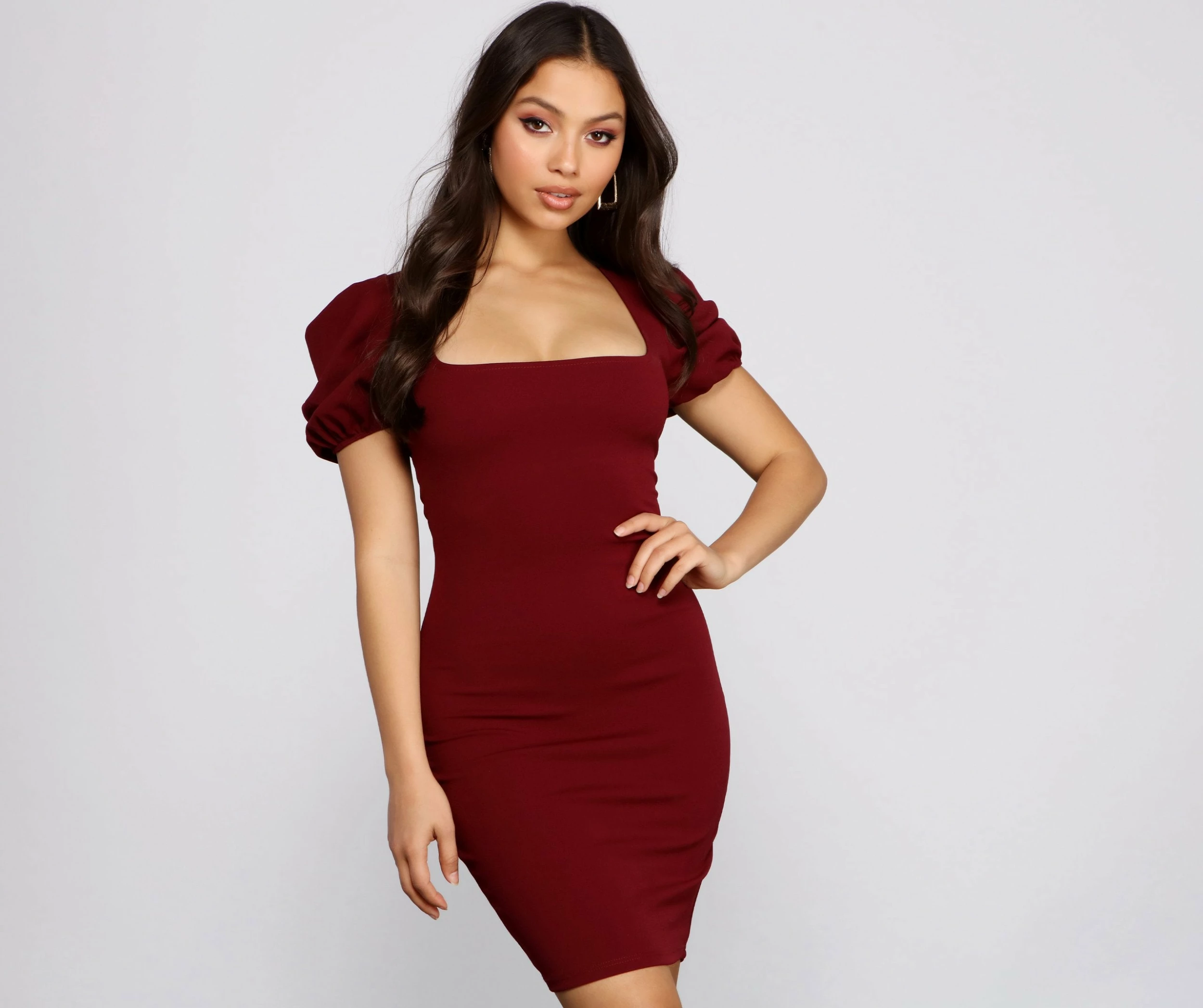 Create a sweet moment in this alluring mini dress for your next date night! The dress features a square neckline, bold short puff sleeves, and a mini-length silhouette. The dress is composed of a crepe fabric that offers a form-hugging fit with a moderate stretch. Complete the look with