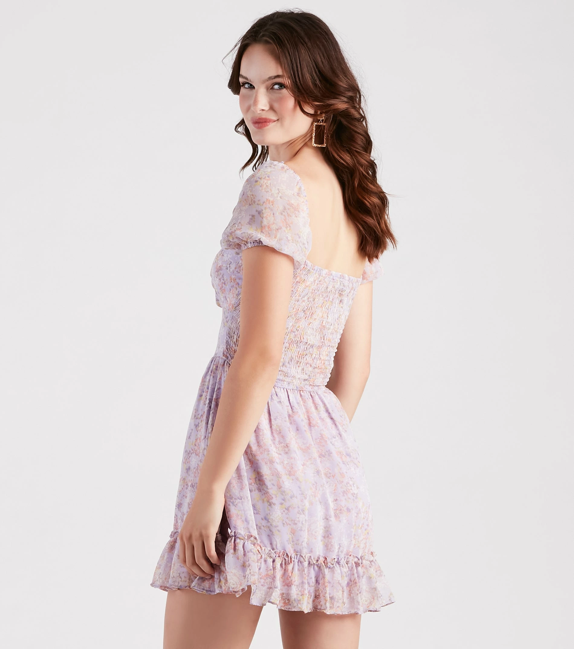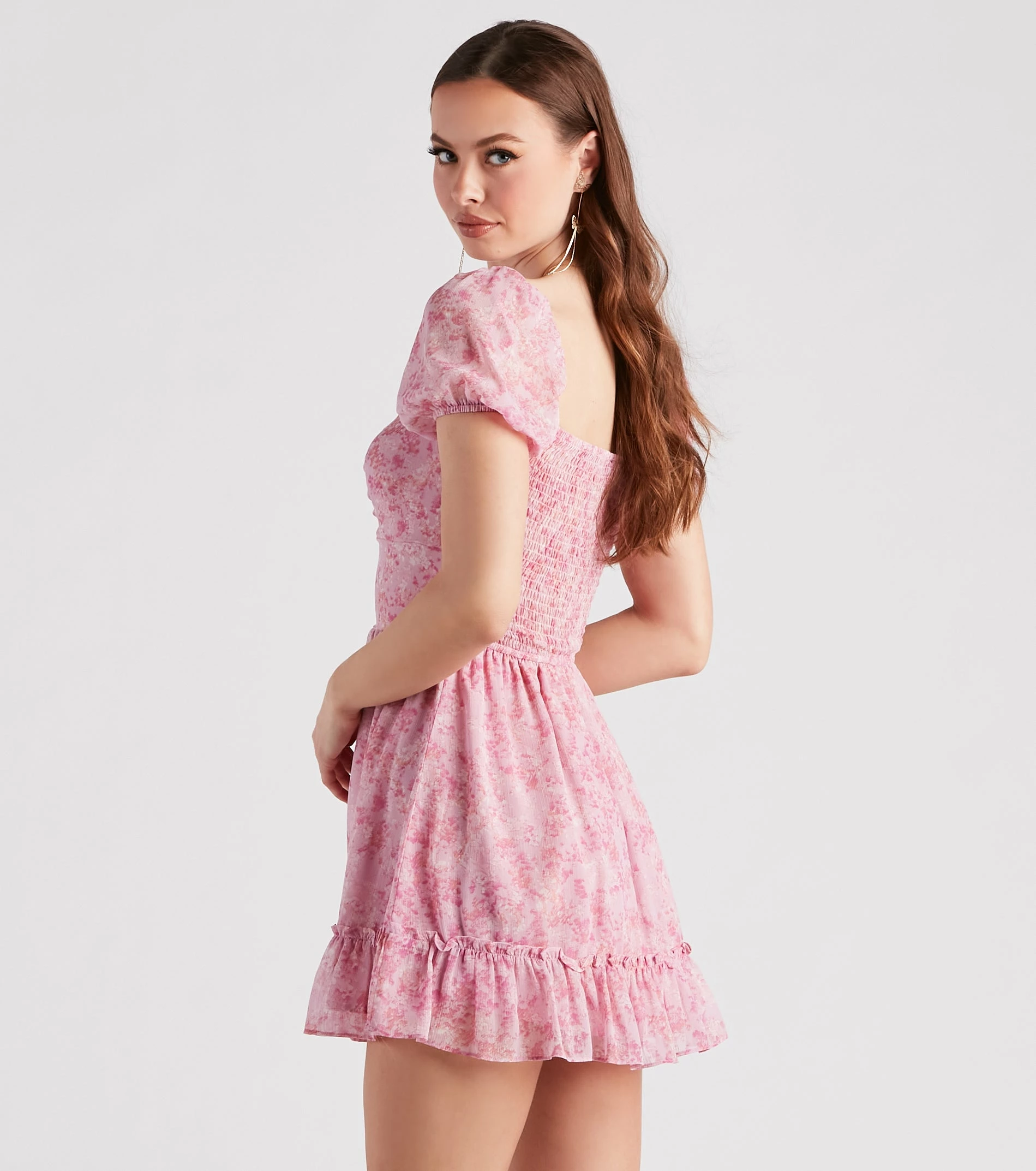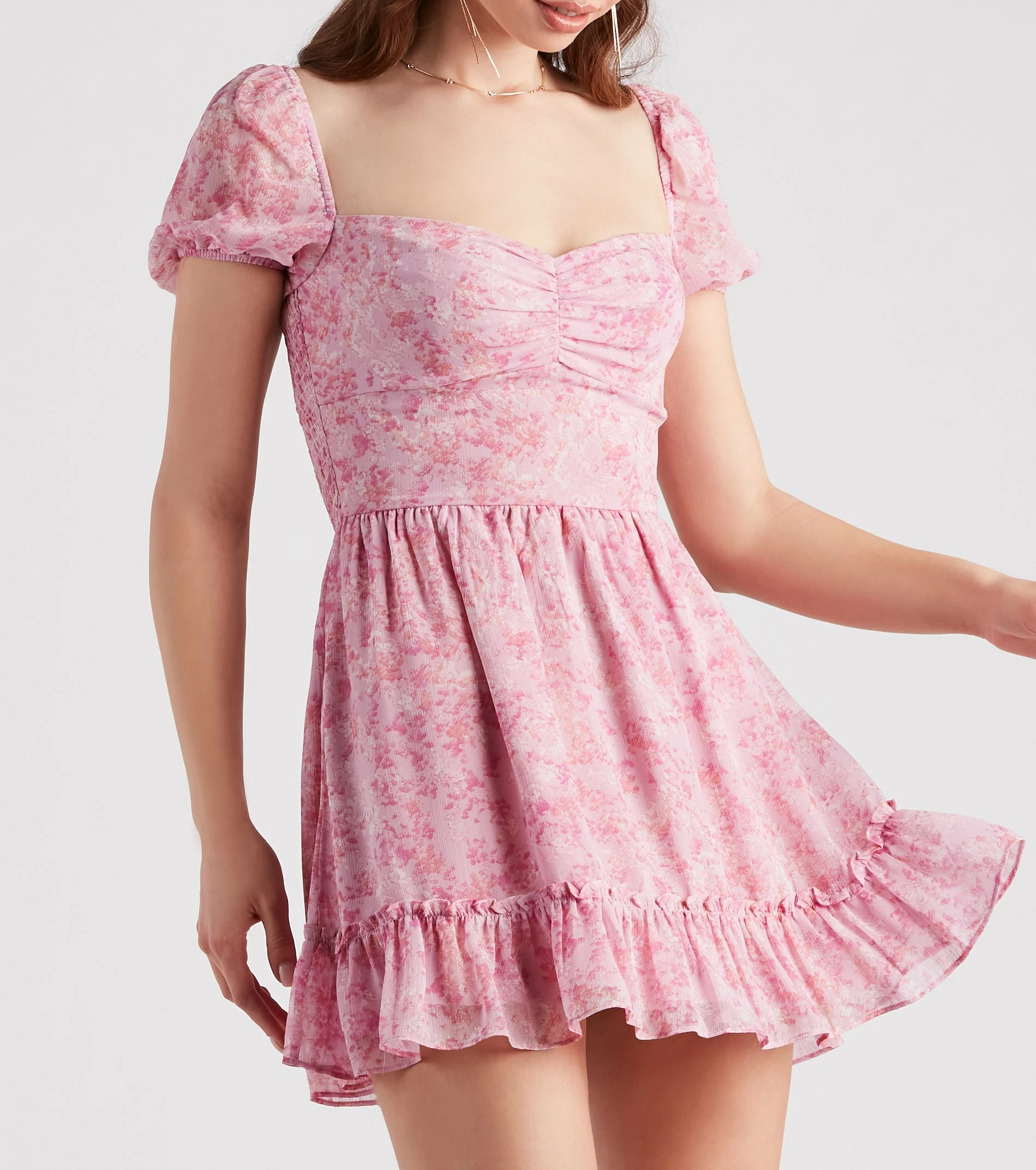 This adorable floral skater dress will bring those sweet spring vibes to your look! It features a sweetheart neckline, short puff sleeves, a high waist, a short skater skirt with a ruffled hem, and a fit and flare silhouette. The lightweight chiffon fabric features a dainty floral print pattern. Style with