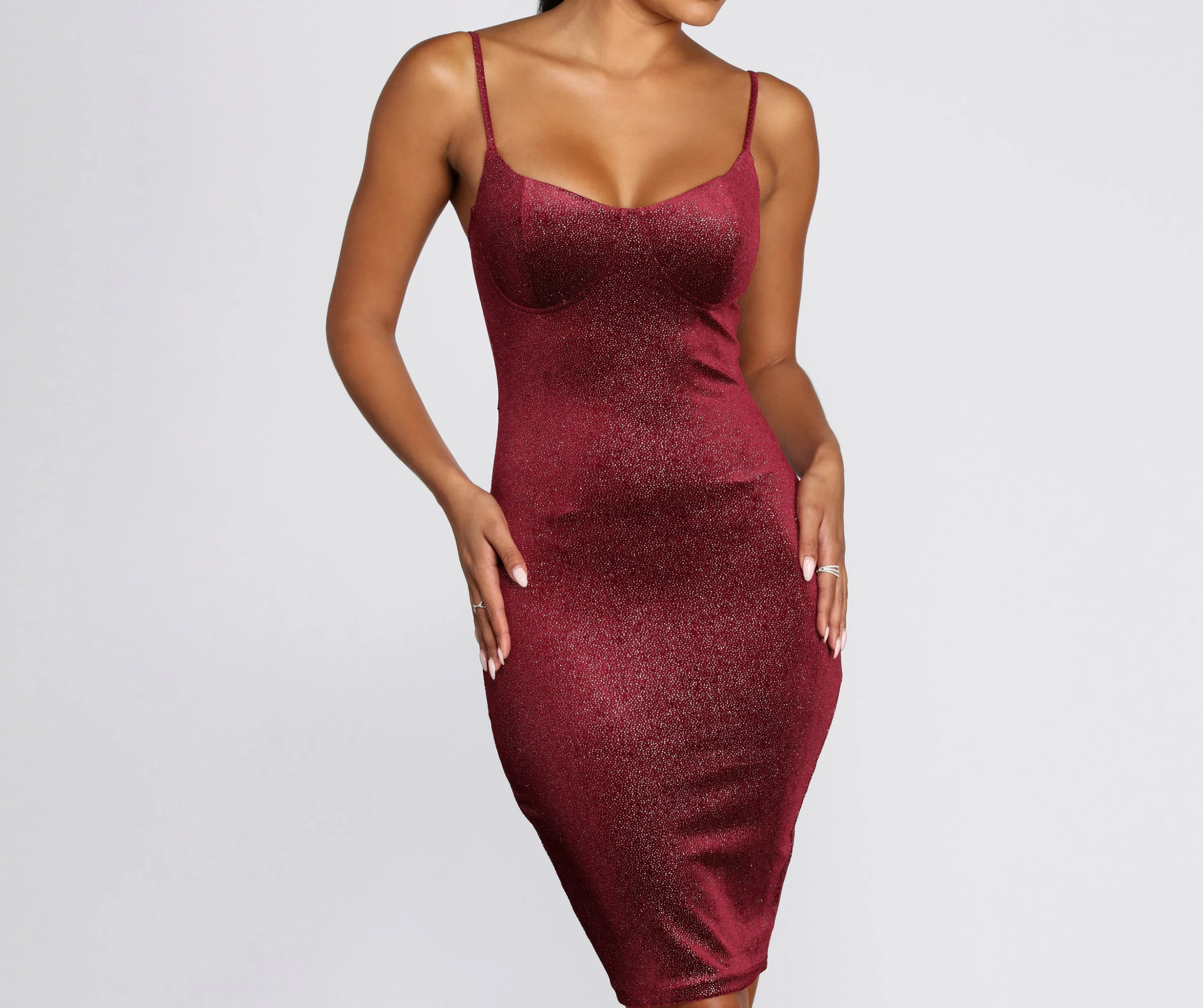 Sweetheart you are a true stunner! Designed with adjustable spaghetti straps, a sweetheart neckline, padded and structured cups, and a form fitting silhouette this midi dress is a ten out of ten. Composed of a velvet material that offers moderate stretch and is embellished with silver glitter reflects throughout. Dress is fully lined and has a zipper closure with a hook and eye to keep dress in place all night long!