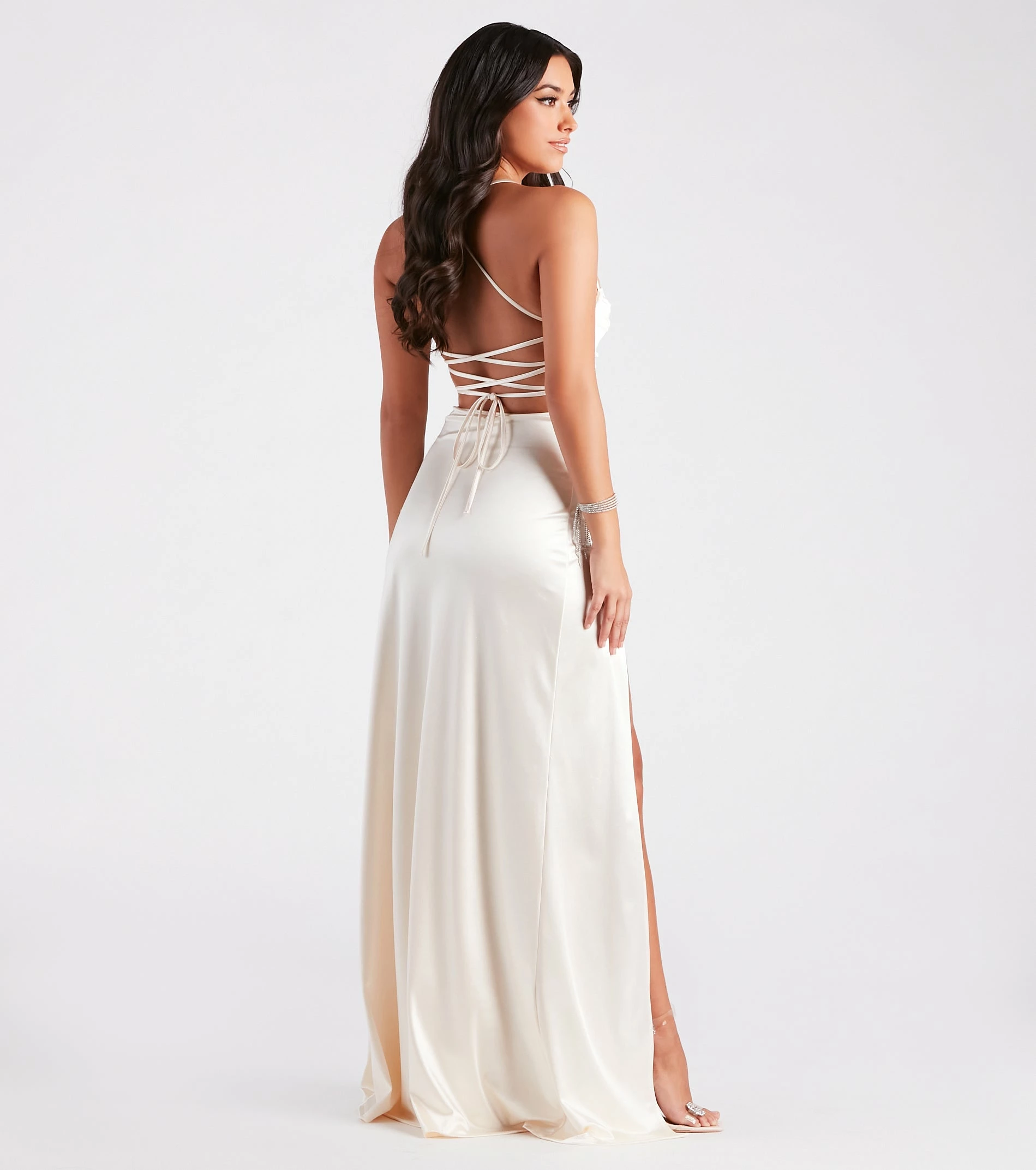 Make a striking impression in the Trixie formal dress at balls and banquets! She features a sleeveless sweetheart neckline with a cowl pleated bust, halter spaghetti straps, a lace-up back design, and a flattering A-line silhouette showcasing a sultry high-cut slit along her floor-length hem. The formal dress is composed of a smooth and silky satin fabric with a subtle sheen. Style with a