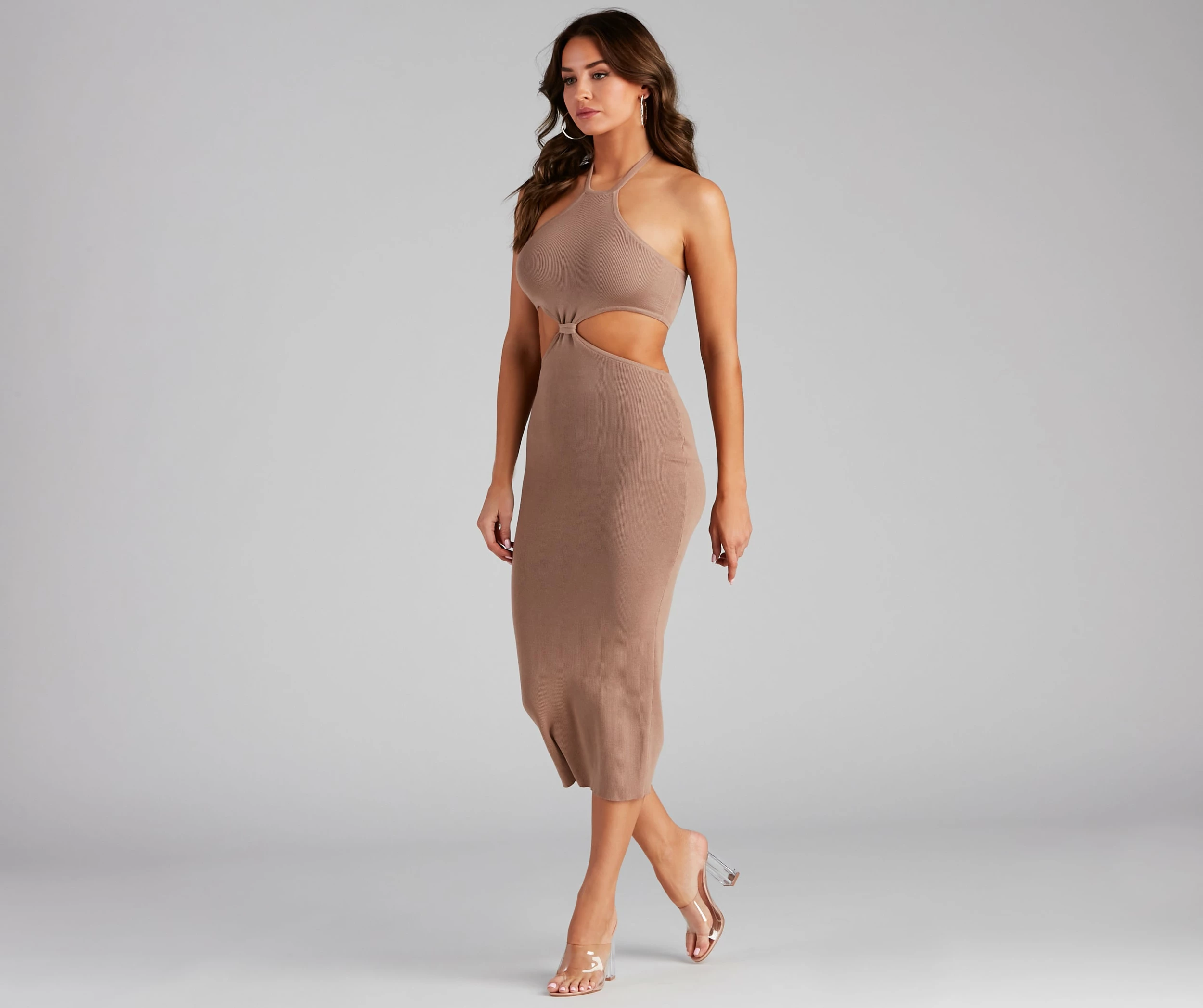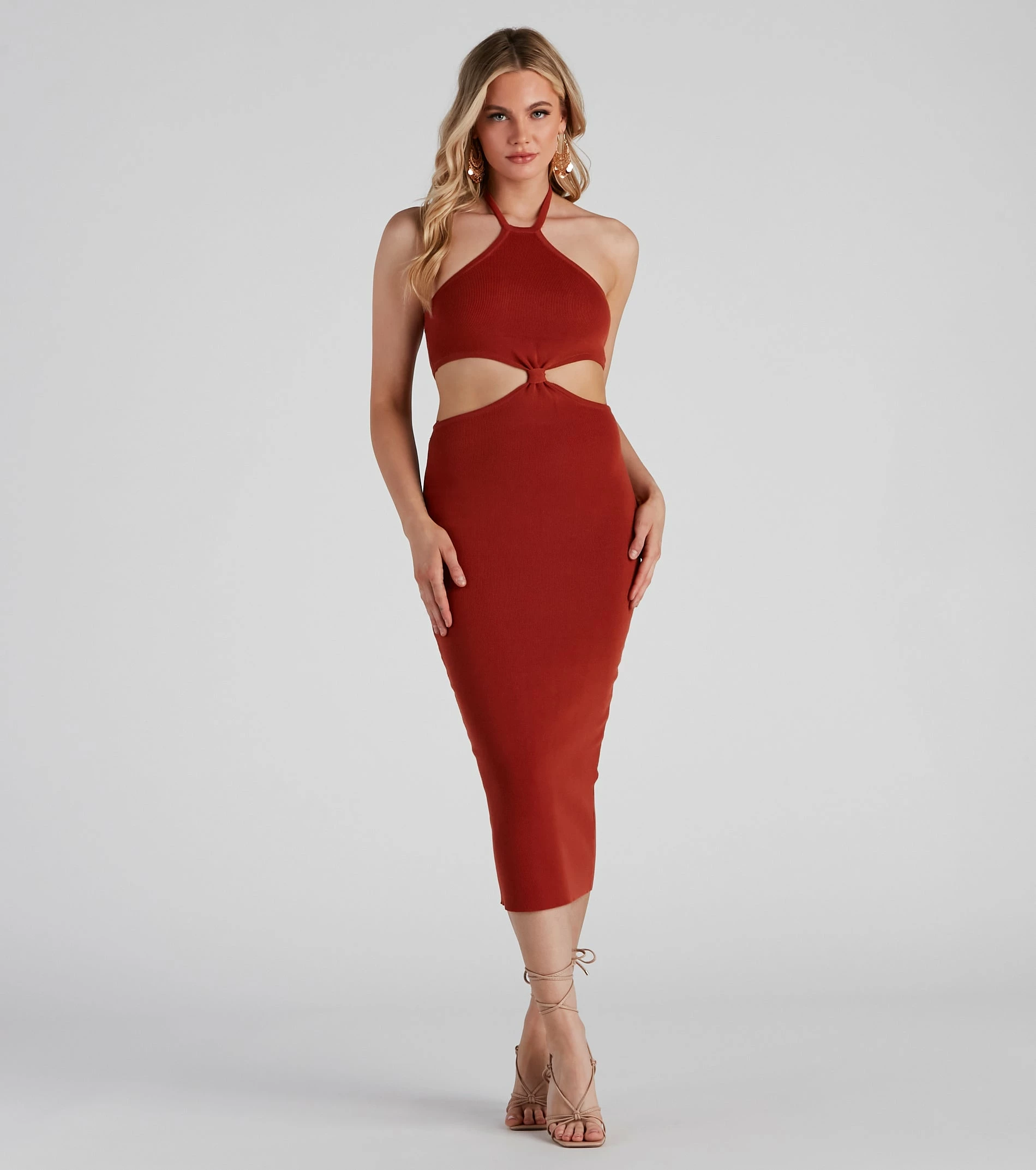 It’s vacay season and this halter midi dress is here for it! Featuring a sleeveless, high neckline with a tie closure, cutout bodice with a cinch accent, and a bodycon midi-length hem. Composed of a nylon-blend knit fabric with a moderate stretch. Finish the look with trendy