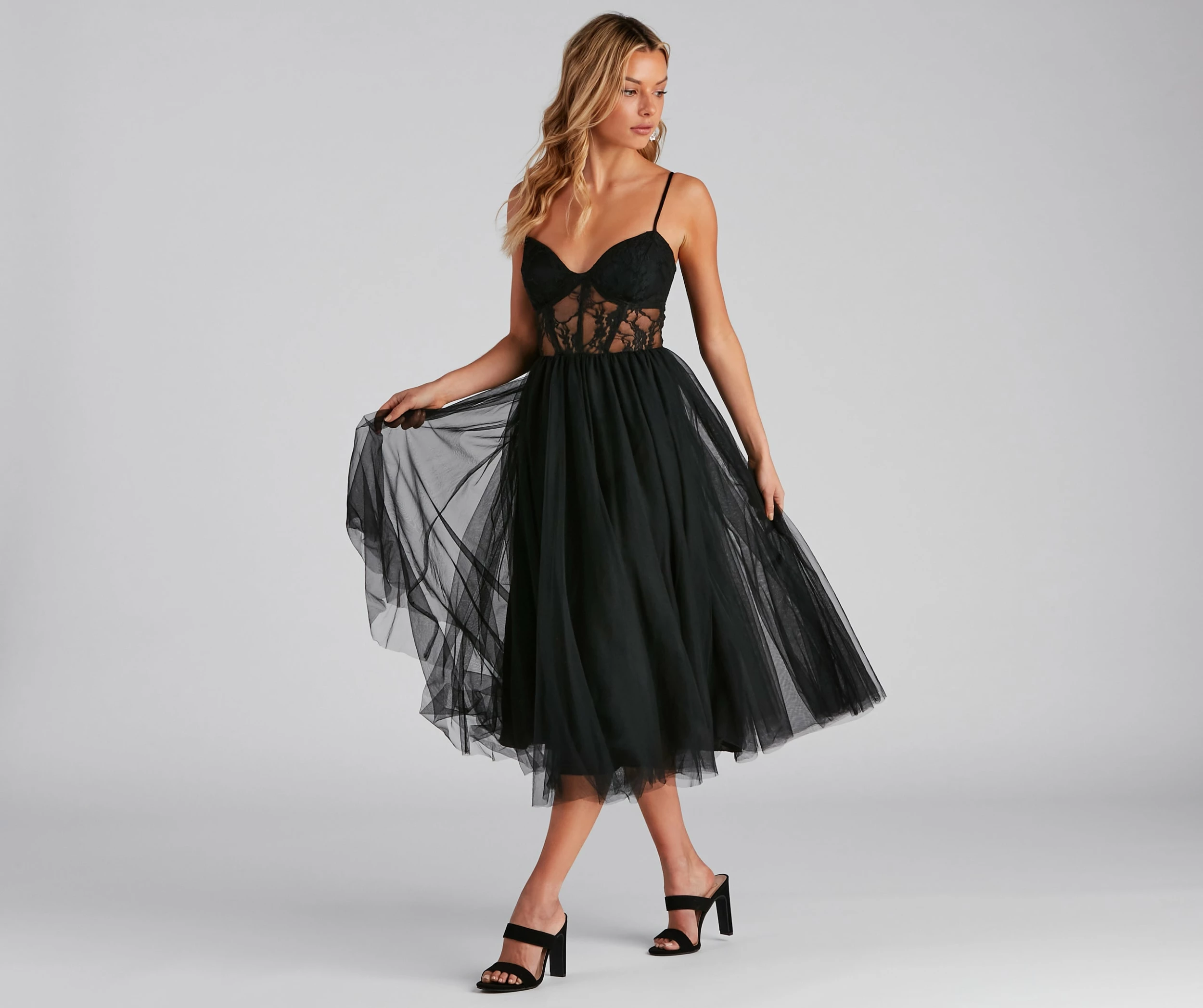 - Lace illusion corset-style bodice, flexible boning