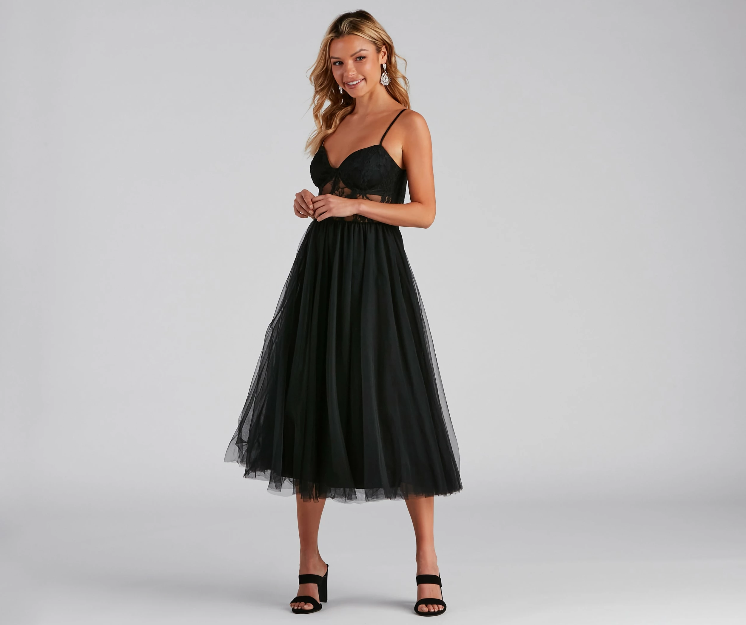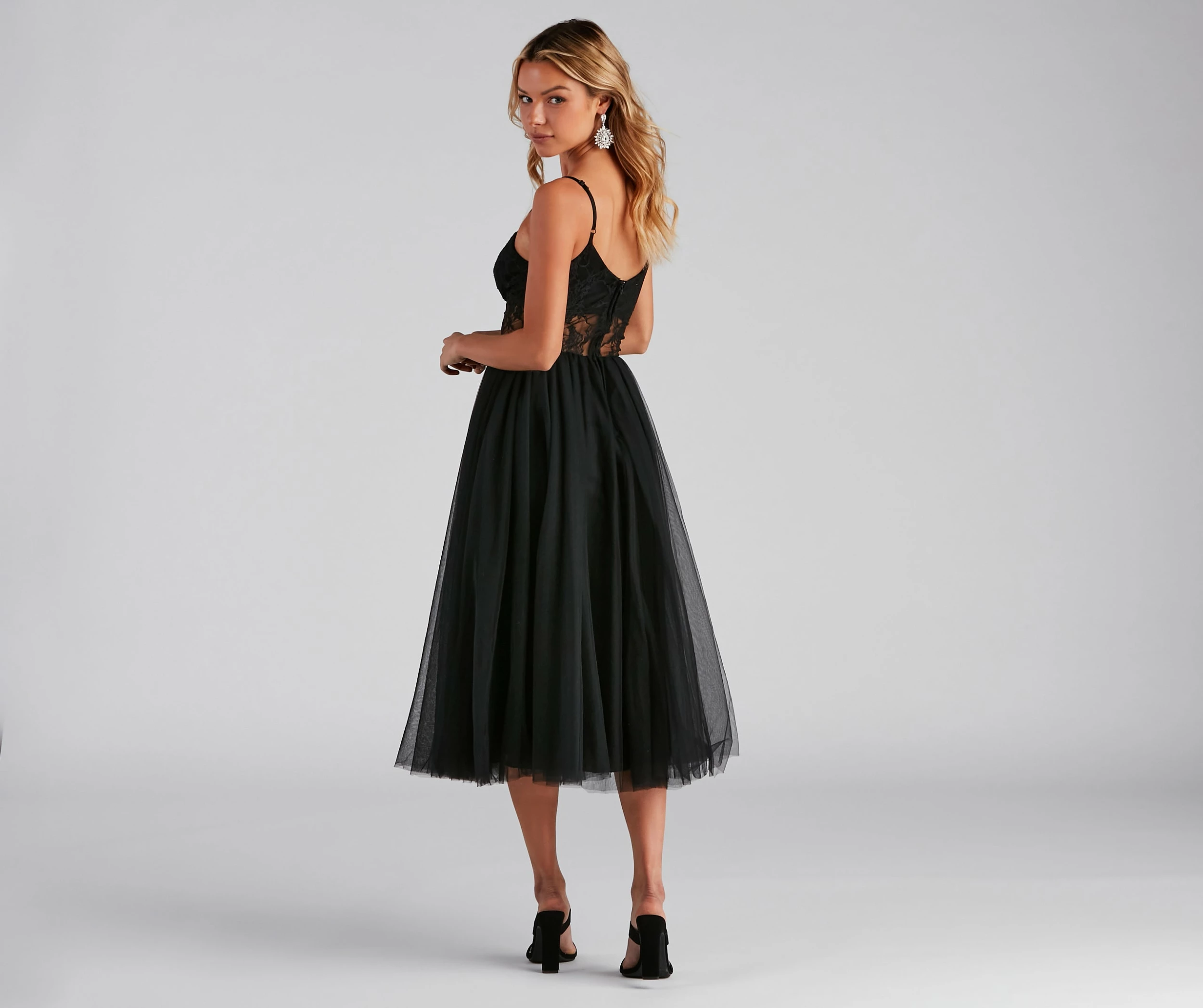 Sultry yet whimsical, the Vanae formal dress brings romantic allure in her twirl-worthy tulle skirt and lace illusion bodice! She features a classy sleeveless V-neck, adjustable spaghetti straps so you can customize the fit, and a corset-style bodice with flexible boning inserts for structure and shaping. Her flowy A-line silhouette hits mid-calf – perfect for flaunting some gorg