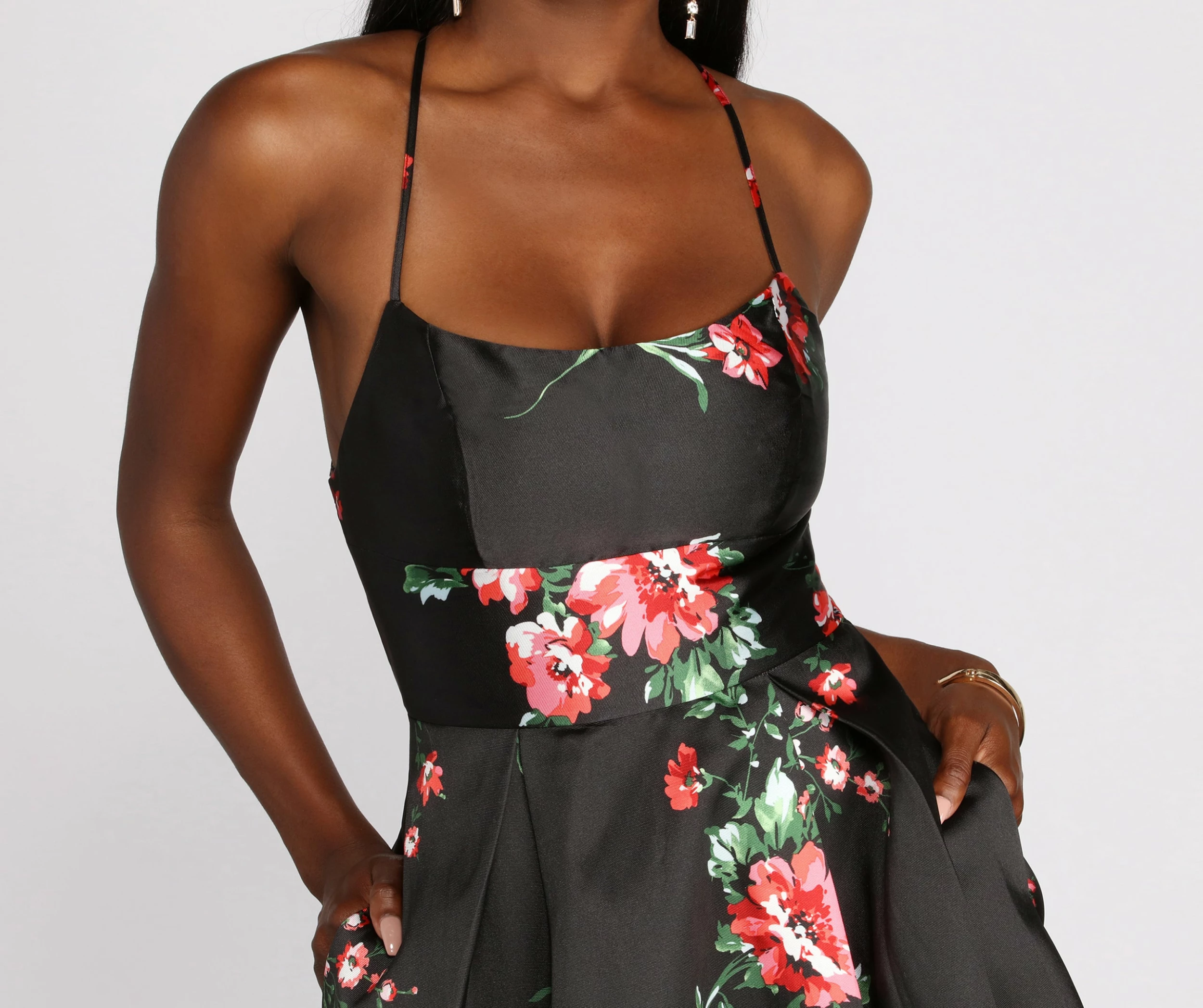 Bring the charm in our lovely Viona floral lattice dress! She features a sleeveless scoop neckline with padded cups, adjustable spaghetti straps leading to a lattice back design, a high waist with a fit and flare party skirt silhouette, and a chic all-over floral print. Style the dress with twinkling