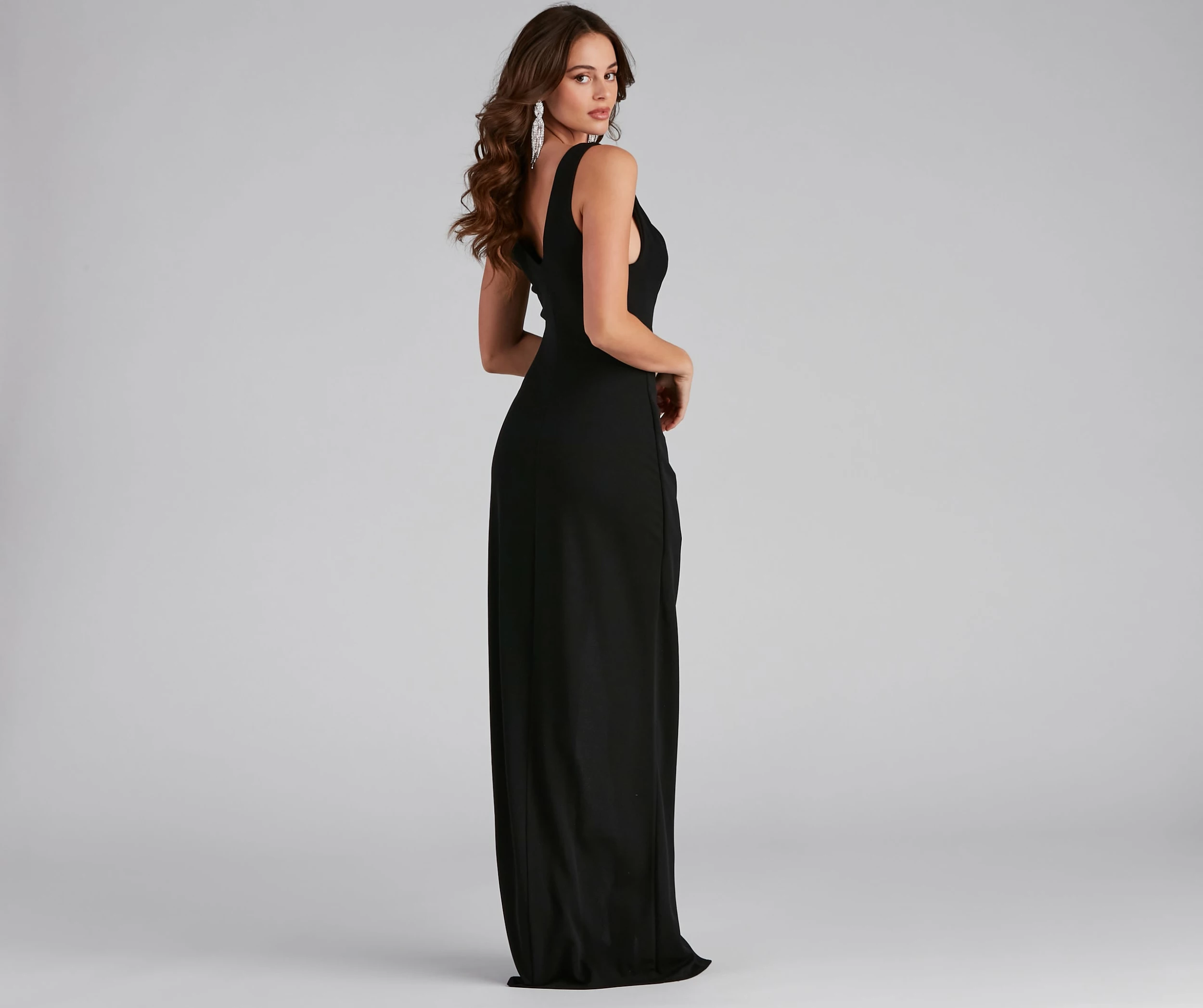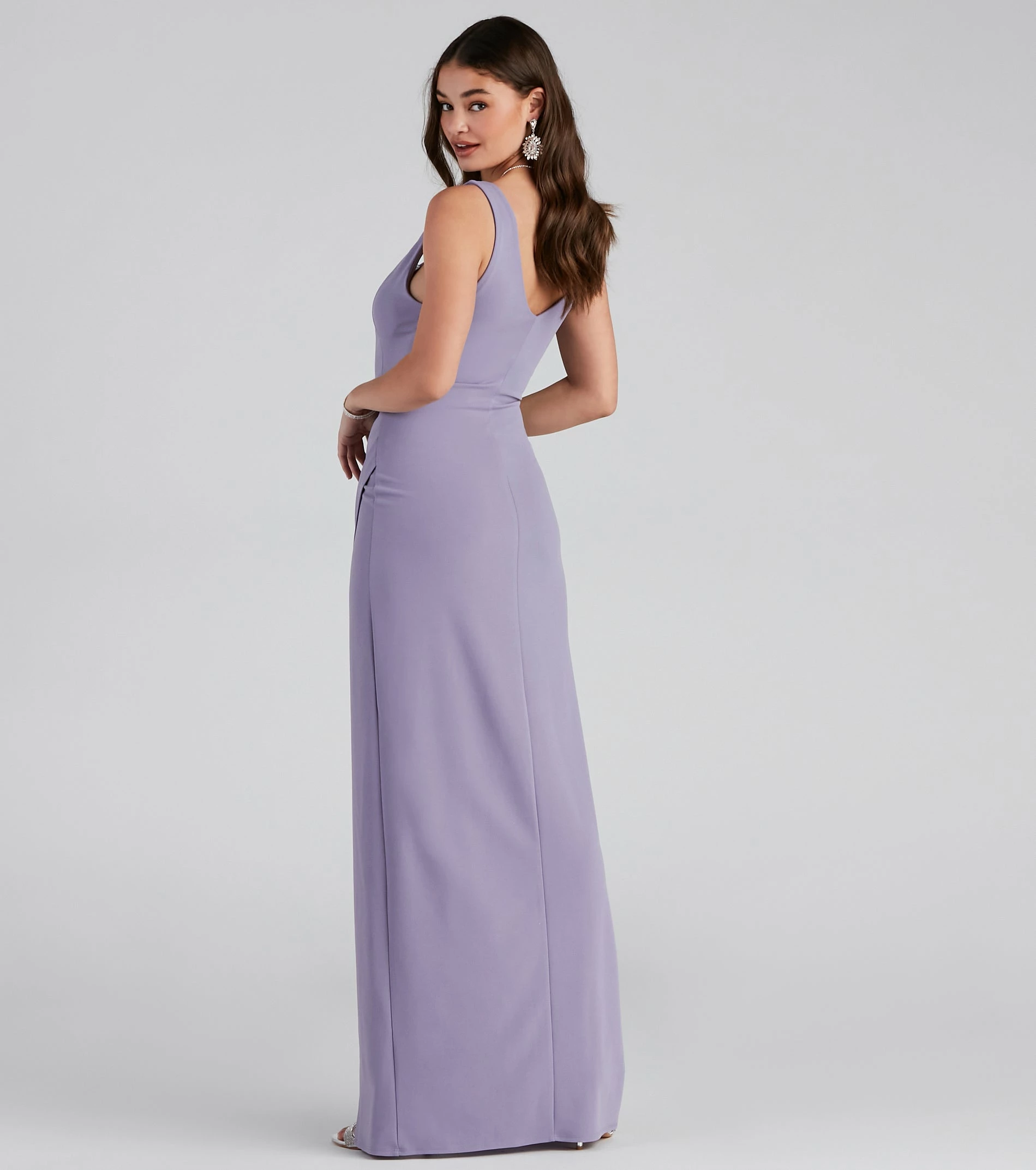 Make an entrance that will draw all eyes on you in our captivating Viv formal dress! Her silhouette hugs curves to create an hourglass illusion! She features a sleeveless V-neckline with mesh insert, shoulder straps, padded cups for a supportive fit, and a wrap mermaid silhouette. Pair her with