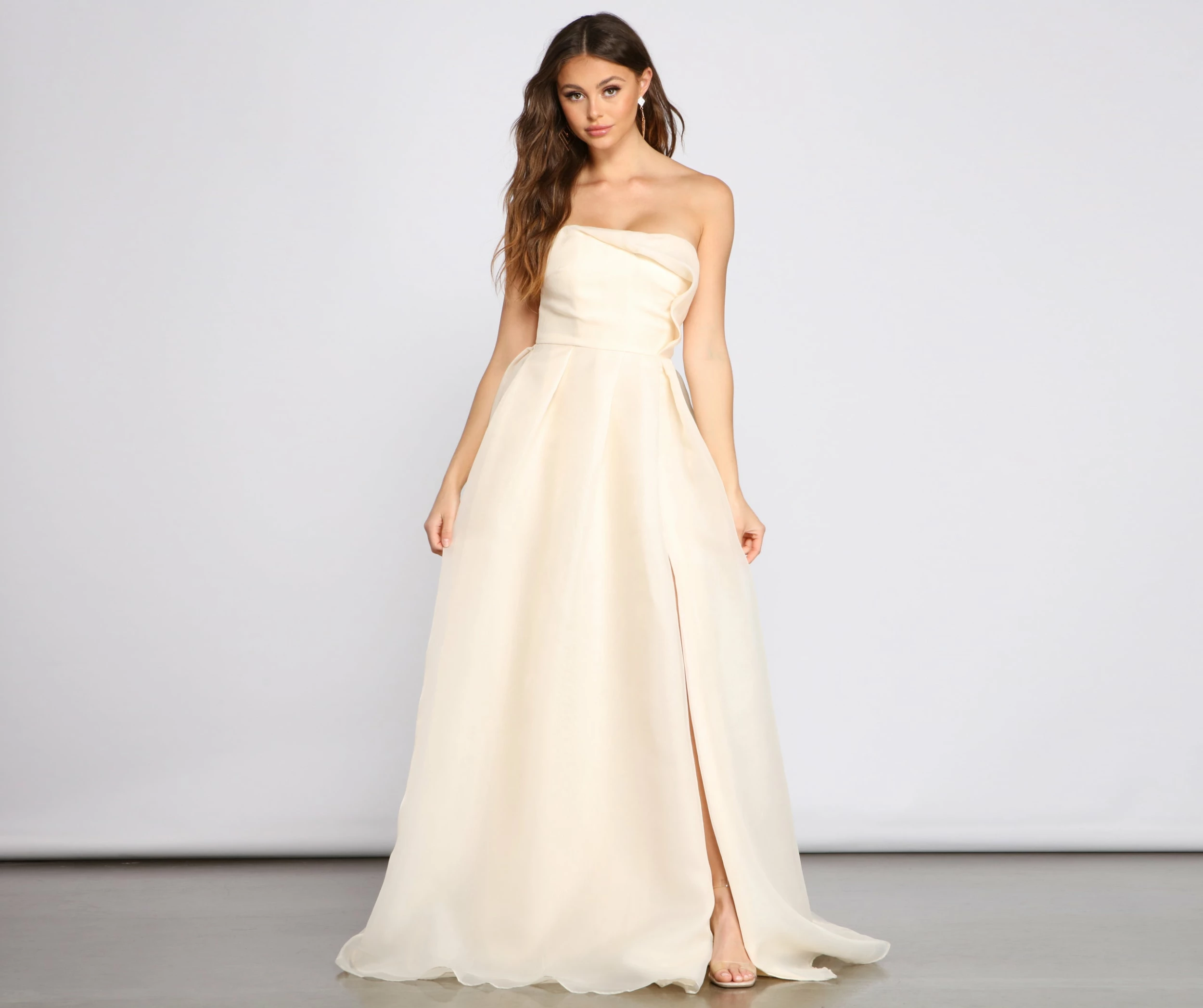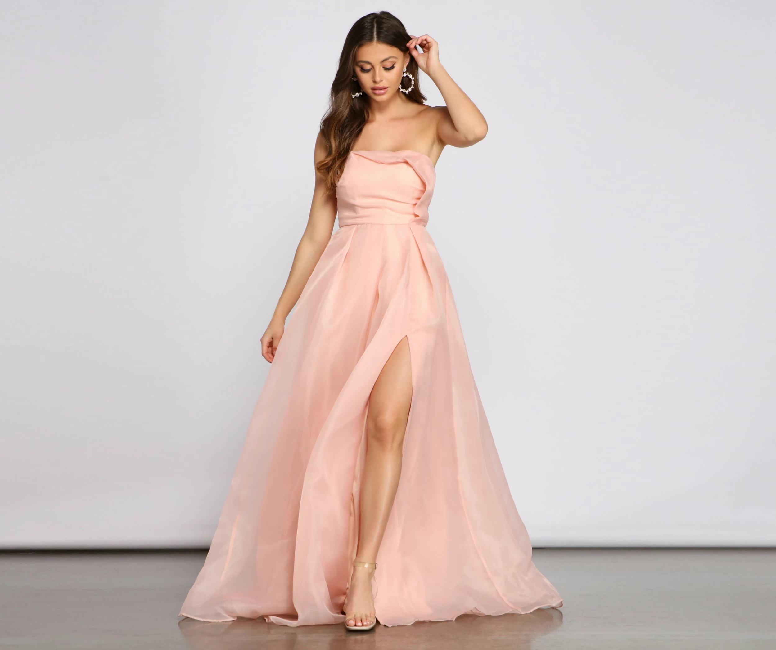 Mesmerize them all with a formal dress that wows! Zora features a sleeveless square neckline, a ruffled accent at the bodice, a voluminous A-line silhouette with a high side slit. The dress is composed of a woven satin fabric that offers a form hugging fit with minimal stretch. Complete look with